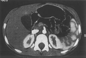 Figura 2. Disminución difusa y homogénea de la atenuación del páncreas, que muestran un tamaño en los límites bajos de la normalidad. Los hallazgos se relacionan con una infiltración grasa global de la glándula pancreática.