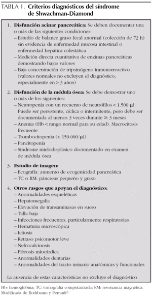 Se trata de un trastorno multisistémico de herencia autosómica recesiva con una gran heterogeneidad en las manifestaciones clínicas. Presenta una incidencia de 1/100.000-1/200.000 nacidos vivos 5. Los rasgos centrales del síndrome son la disfunción pancreática exocrina y la disfunción de la médula ósea (sobre todo neutropenia). Otros rasgos que apoyan el diagnóstico son las anormalidades esqueléticas, hepatomegalia, elevación de transaminasas en suero, corta estatura e infecciones frecuentes.