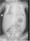 The patient was admitted to the intensive care unit, with subsequent detection of coagulopathy, cholestasis and persistent thrombocytopenia despite multiple transfusions. The results of cultures and serological tests were negative. The peripheral blood smear examination revealed the presence of vacuolated lymphocytes. The postnatal radiograph and ultrasound examinations detected hepatosplenomegaly (Fig. 3).