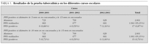 A pesar del incremento de población inmigrante en nuestro entorno la prevalencia de infección tuberculosa en pacientes menores de 6 años no se ha incrementado en los últimos años: en 1998, en un estudio realizado en dos áreas básicas de salud de nuestra comarca se encontró en el 1 % de la población de 4 años frente al 0,87 % en el estudio actual. Esta prevalencia tampoco es muy diferente de la publicada en otros estudios realizados en España durante los últimos 8 años 2,3 aunque sí inferior a los datos de la población pediátrica de Ciutat Vella de Barcelona publicados por Masvidal et al 4. Estos datos contrastan con los publicados en poblaciones de adultos 5.