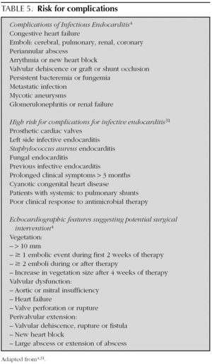 The clinical situations that favour complications 4,31,32 and surgical indications according to the anomalies found at echocardiography are listed in table 5. Coward et al 33 reported a 49 % incidence of complications. Mylonakis et al 15 found 20-25 % adult mortality secondary to endocarditis. Danilowicz 6 recorded a 20-30 % incidence of mortality in paediatric age patients, but recently some authors 33 have determined the incidence to be 12 %.