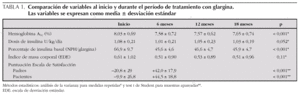 En la tabla 1 se comparan las variables al inicio, durante y al final del período de tratamiento con la nueva pauta, con mejoría significativa de los niveles de HbA1c y de las puntuaciones en la Escala de Satisfacción.