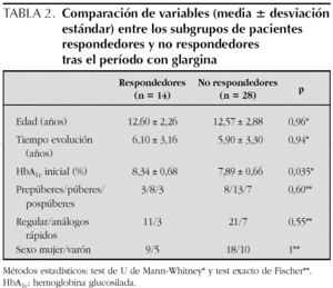 En la tabla 2 se comparan las variables entre los 2 subgrupos de pacientes: "respondedores" (12 casos) y "no respondedores". Sólo el nivel de HbA1c previo fue significativamente diferente, mayor, en los primeros. Ninguna otra variable se relacionó con la buena respuesta, incluido el tipo de insulina rápida utilizado junto a glargina (regular o análogos).