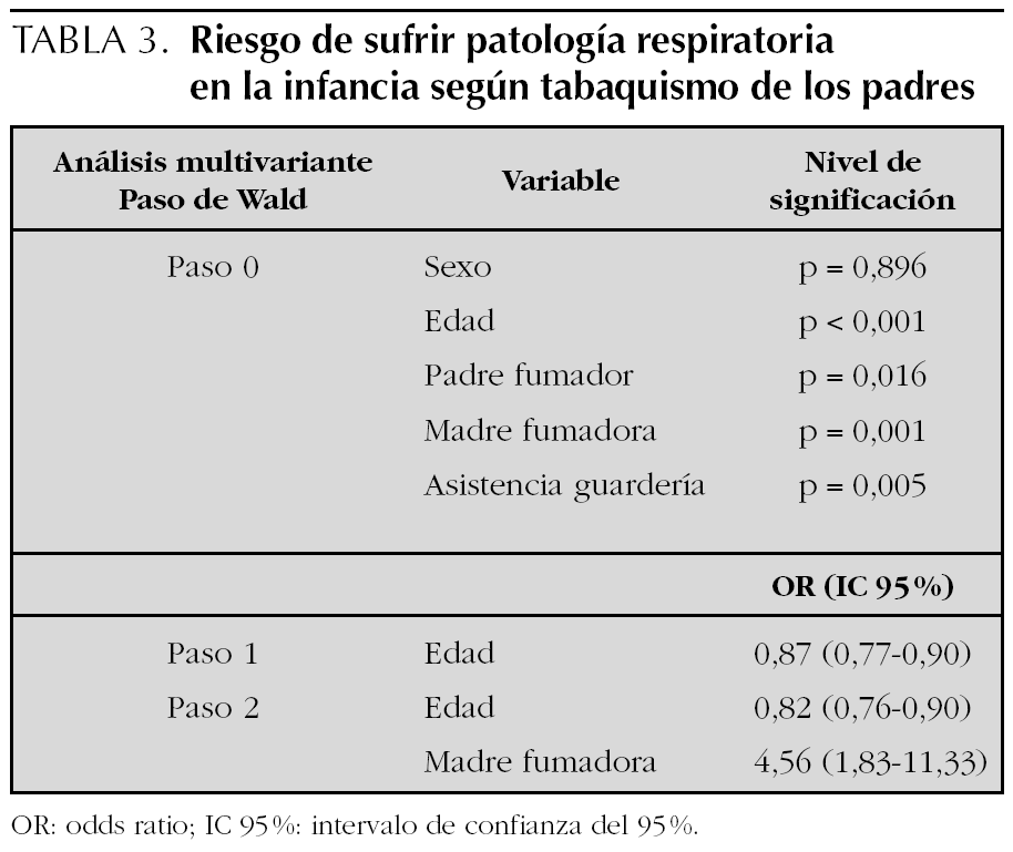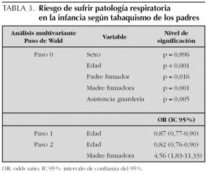 En el análisis estadístico bivariante se halló una relación estadísticamente significativa entre hábito tabáquico de los padres e incidencia de patología respiratoria de vías bajas en los niños. Sin embargo, la relación entre padre fumador e incidencia de patología de vías altas no fue estadísticamente significativa. En cuanto a la relación de las mismas con el tabaquismo materno hallamos significación estadística con las vías altas y bajas, obteniendo en ambos casos una p < 0,001 y p < 0,0001, respectivamente. Si lo analizamos con respecto a la existencia de uno o varios fumadores en casa obtenemos significación estadística tanto para vías altas (p < 0,0001) como bajas (p < 0,0001). El 5,1 % de los niños (21/410) resultó estar diagnosticado de asma bronquial. Se detectaron 11 niños con uno o varios episodios de neumonía, cinco con bronquiolitis y 15 de los niños asmáticos presentaron al menos una reagudización de su patología.