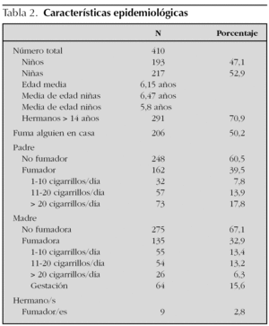 La muestra final analizada constaba de 410 niños. El 47,1 % eran niños (193/410) y el 52,9 % niñas (217/410). La edad oscilaba entre 1 y 14 años de edad, con una media de 6,15 años, siendo las principales características epidemiológicas las mostradas en la tabla 2. Todas las madres que fumaron durante el embarazo siguieron haciéndolo a lo largo de 2003. El 51,85 % de las madres fumadoras (70/135) no lo hicieron en la gestación. La asistencia a guardería fue de un 42,21 % (76/189 niños) con respecto al total de población menor de 4 años. Sólo refirió fumar un chico y su edad era 14 años. En un 94,1 % (341/362) fue parto a término y el 93,82 % (334/356) recibió lactancia materna en el período neonatal.