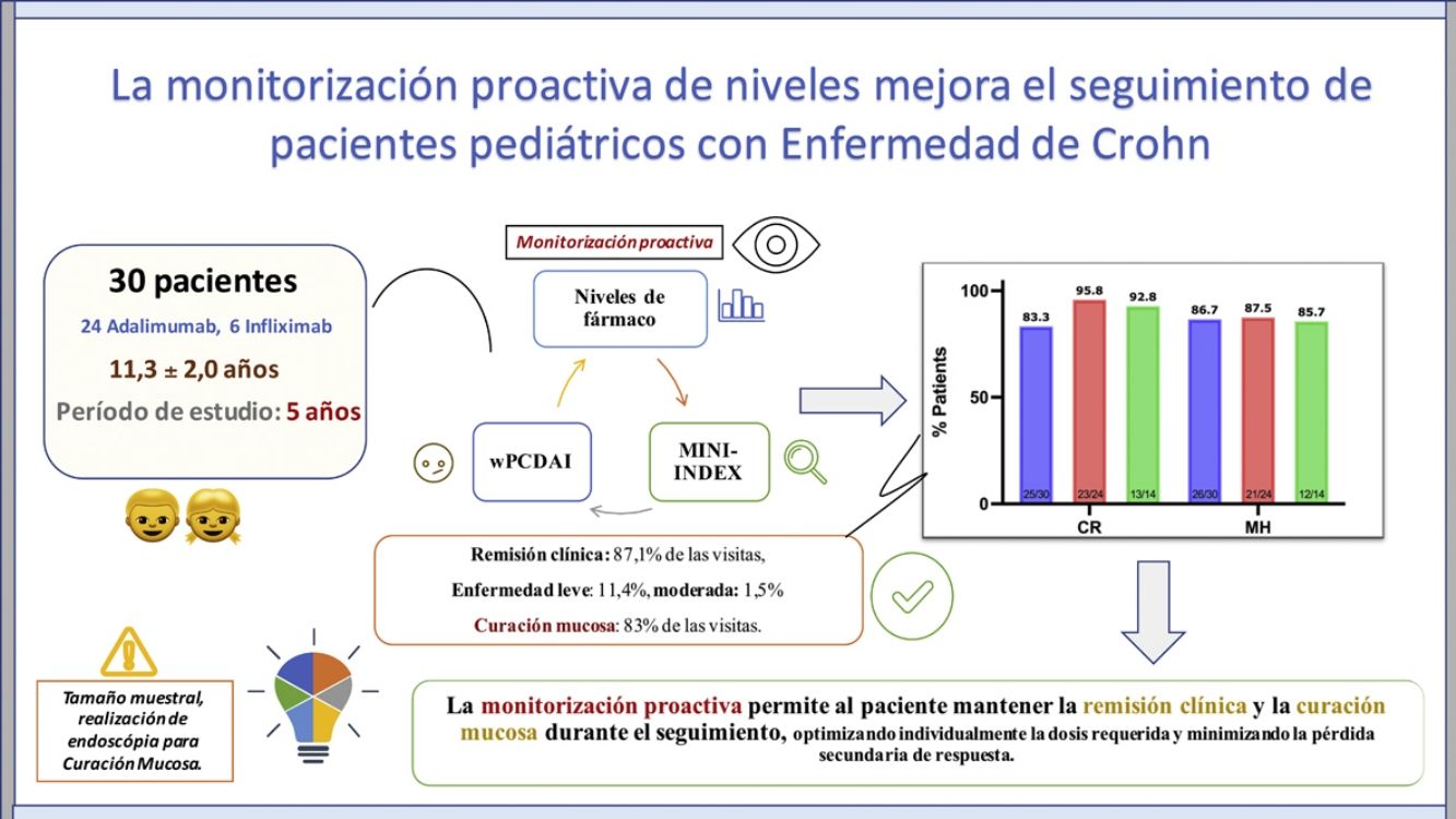 La incidencia de la enfermedad inflamatoria intestinal pediátrica ha aumentado en las últimas décadas. El objetivo del presente estudio fue evaluar el papel de la monitorización proactiva y en serie de los niveles de fármacos anti-TNF (factor de necrosis tumoral) para mantener la remisión clínica y la curación mucosa durante el seguimiento de pacientes pediátricos con enfermedad de Crohn (EC).