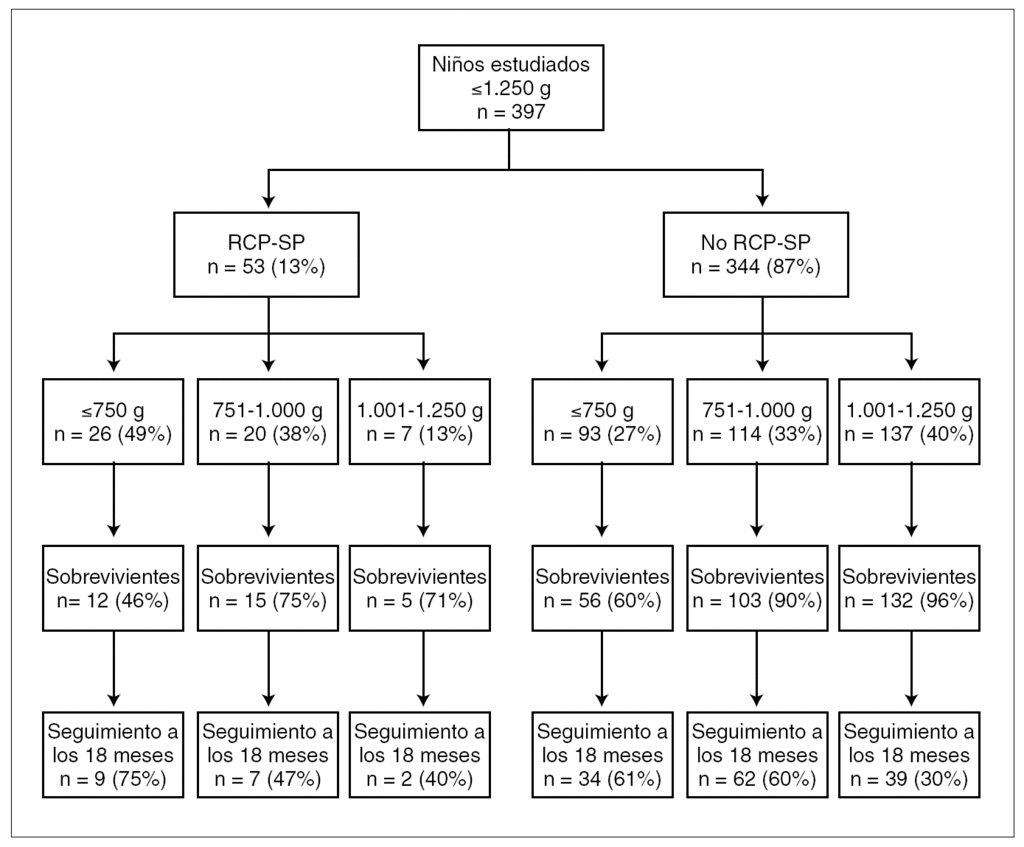 En conclusión, basados en nuestros hallazgos, concluimos que la RCP-SP en recién nacidos muy prematuros se asocia con más mortalidad y morbilidad. En aquéllos con peso entre 1.001 y 1.250 g la RCP-SP es un buen predictor de mortalidad durante la hospitalización y de resultados adversos combinados a corto plazo. Además, la RCP-SP es también un predictor de HIC-S en recién nacidos con peso al nacer entre 751 y 1.000 g. La magnitud del riesgo de resultados adversos a corto plazo asociados con RCP-SP disminuye a medida que el peso al nacer disminuye. Finalmente, la RCP-SP se asocia con peores resultados del neurodesarrollo a largo plazo en niños evaluados detalladamente a los 18 meses de edad corregida.