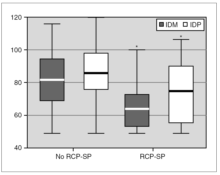 Figura 2. Comparación de los índices del Bayley-II a los 18 meses de edad corregida.*p < 0,05. Valores de IDM: No RCP-SP 81,3 ± 17,7 frente a RCP-SP 67,7 ± 18,3; p = 0,006. Valores de IDP No RCP-SP 85,1 ± 17,2 frente a RCP-SP 74,4 ± 19,9; p = 0,027. IDM: índice de desarrollo mental; IDP: índice de desarrollo psicomotor; RCP-SP: resucitación cardiopulmonar en sala de partos.