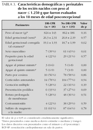 Los acontecimientos que ocurren alrededor del nacimiento tienen un impacto profundo en la morbilidad y mortalidad de los recién nacidos extremadamente prematuros 1. La incidencia de hemorragia intracraneana severa (HIC-S), leucomalacia periventricular (LPV) y la mortalidad están influenciadas por numerosas variables prenatales y posnatales 2,3. La reanimación cardiopulmonar en sala de partos (RCP-SP) puede ser un episodio con influencias en éstos y otros resultados pero no ha sido incluido como factor de riesgo en estudios que describen resultados a corto y largo plazo de recién nacidos muy prematuros.