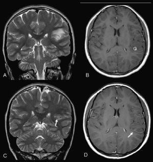 Figura 1. A) Resonancia magnética (RM) al diagnóstico turbo spin echo (TSE) T2 coronal. B) RM al diagnóstico spin echo (SE) T1 poscontraste axial. C) RM postratamiento TSE T2 coronal. D) RM postratamiento SE T1 poscontraste axial. Lesión quística con un pequeño nódulo mural, subcortical temporoparietal izquierda de 9 mm de tamaño, con importante edema vasogénico y realce anular compatible con un estadio vesiculocoloidal. En el control postratamiento (flechas) ha disminuido de tamaño, con desaparición del edema y un fino realce periférico residual (estadio nodulogranular).