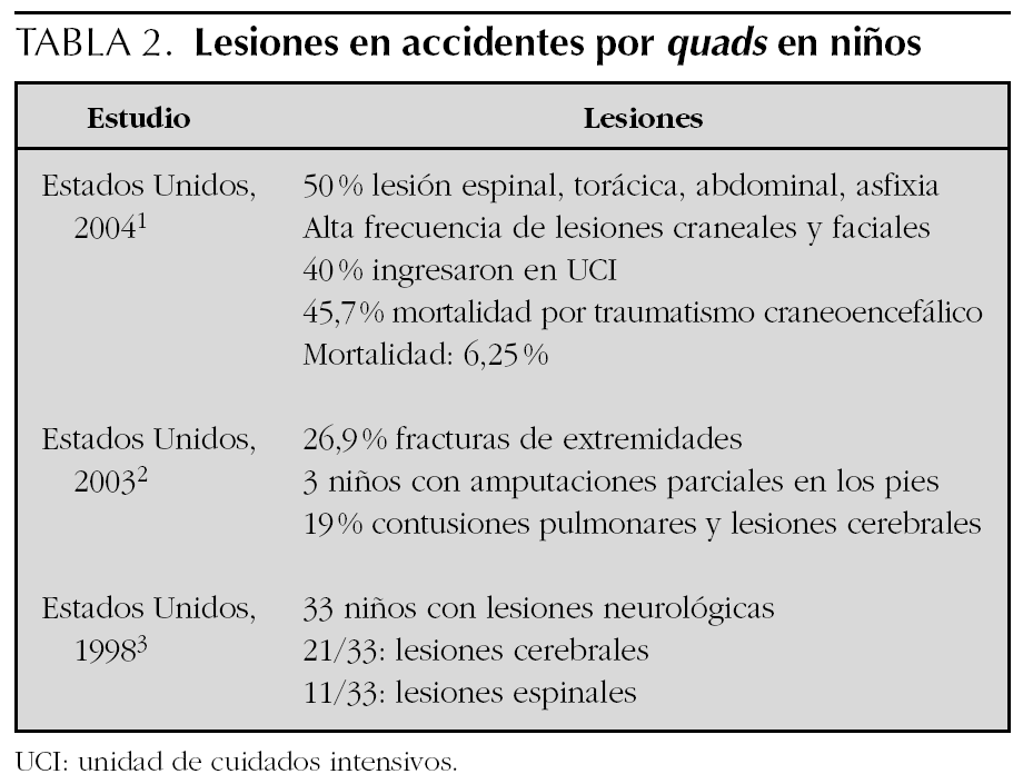 El uso y la venta de los quads o ATV (all-terrain vehicles) ha aumentado en los últimos años: en España se vendieron unas 8.000 unidades en 2002 y en Estados Unidos circulan aproximadamente 7 millones, todos ellos destinados en su mayoría al ocio y al uso deportivo. Este uso masivo en Estados Unidos se ha acompañado de un gran número de accidentes 1-9. En 1980 en Estados Unidos los vehículos todo-terreno de tres y cuatro ruedas fueron vendidos como juguetes para uso de toda la familia, pero ya en 1986 causaron 106.000 visitas a urgencias y 347 muertes, el 40 % en menores de 16 años 10. Entre los años 1997 y 2000 causaron 5.292 hospitalizaciones en niños, con un aumento del 79,1 % en este período y una mortalidad del 1 % 5.