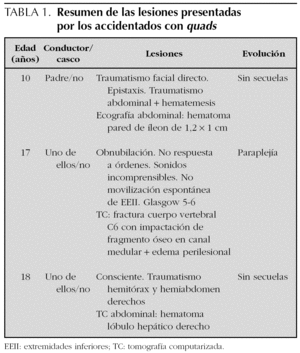 Hemos atendido en los últimos meses varios casos de accidentes de quad en los que se han visto implicados niños y adolescentes, con lesiones graves en uno de los casos (tablas 1 y 2). Deseamos alertar sobre el mal uso de estos vehículos y las indefiniciones legales en que se encuentran.