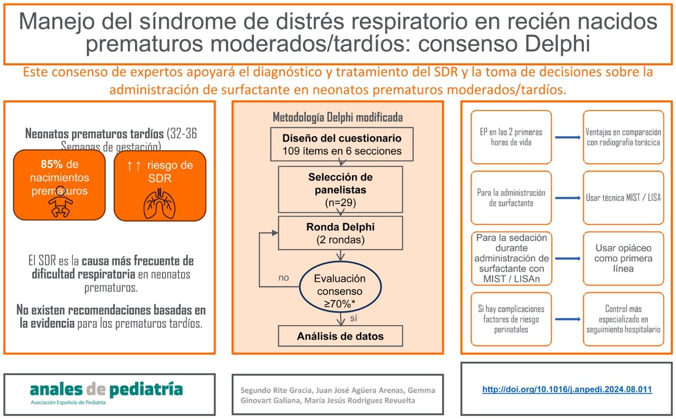 ResultadosSe alcanzó consenso en 98 de los 109 ítems incluidos. Se recomendó la realización de una ecografía pulmonar y la consideración de la dificultad respiratoria leve, la taquipnea transitoria del recién nacido, la neumonía congénita y la hipertensión pulmonar primaria durante el diagnóstico diferencial. La mayoría de los panelistas coincidieron en la necesidad de realizar estudios para determinar el riesgo/beneficio, el perfil clínico y los métodos de administración de surfactante en neonatos prematuros moderados/tardíos. Se recomendó la técnica MIST con dispositivos específicamente diseñados para la administración de surfactante. La mayoría de los participantes coincidieron en recomendar el uso de procedimientos no farmacológicos de sedación durante el MIST y, en caso de ineficacia, un opiáceo. Todos los encuestados coincidieron en que los prematuros moderados/tardíos presentan mayor riesgo de morbimortalidad neonatal, en particular de problemas respiratorios, y consideraron necesario más monitorización especializada en el seguimiento hospitalario de neonatos con mayor riesgo y/o complicaciones. Por último, todos los encuestados coincidieron en la falta de estudios para identificar factores de riesgo y resultados adversos a medio plazo en neonatos prematuros moderados/tardíos.
