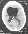 Pruebas complementarias: radiografía lateral de cráneo (fig. 1): neumoencéfalo en los ventrículos laterales (neumoventrículo) y VDVP. TC de cráneo (fig. 2): neumoventrículo con dilatación de los ventrículos laterales y VDVP.