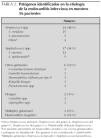 Los hemocultivos fueron positivos en 50 pacientes (89 %). Los cultivos fueron negativos en 6 niños. Cinco de esos 6 pacientes recibían antibióticos en el momento de la obtención del hemocultivo. Se realizaron una media de 3 hemocultivos para cada paciente (con una mediana de 2 y una variación de 0 a 13). Los gérmenes identificados en nuestros pacientes se muestran en la tabla 2. Se halló bacteriemia asociada a Staphylococcus aureus en 12 pacientes (24 % de todos los hemocultivos positivos); de ellos, sólo uno murió. De los 6 niños sanos, cuatro presentaban infección con S. aureus (66,7 %). Un paciente hospitalizado en la unidad de cuidados intensivos (UCI) neonatales con historia de enterocolitis necrosante e ileostomía tuvo hemocultivo positivo para Candida albicans. Se encontró Aspergillum en el estudio patológico en la válvula de un solo paciente. Este paciente tenía una cardiopatía congénita y había sido tratado por una osteomielitis que se complicó con una endocarditis que no respondía al tratamiento médico. El Enterococcus aislado no fue responsable de ningún caso de endocarditis en nuestra serie, pero se encontró asociado a otro organismo en un paciente de la UCI.