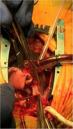 Imagen intraoperatoria de cirugía de Norwood en estadio i de la paliación en paciente con síndrome de corazón izquierdo hipoplásico. Hasta este punto, se ha extirpado el tejido ductal, reparado la coartación y dilatado la arteria pulmonar bajo perfusión cerebral y miocárdica selectiva. En la imagen, se aprecia como la aorta ascendiente diminuta se abre hasta la unión sinotubular, quedando lista para la anastomosis con la arteria pulmonar. Esta parte del procedimiento se realiza bajo perfusión cerebral selectiva.