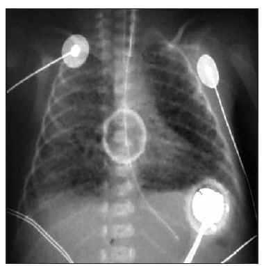 Figura 1. Caso 1. Radiografía de tórax que muestra enfisema intersticial asimétrico y sobredistensión pulmonar.