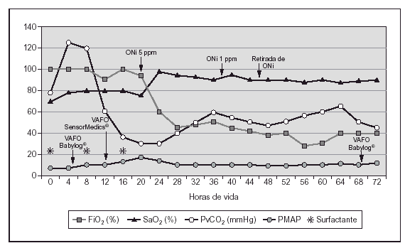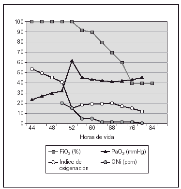 Recién nacido pretérmino de 25 + 6 semanas de edad gestacional y peso al nacimiento de 585 g (percentil 25). Nacido por cesárea por corioamnionitis aguda, con administración prenatal de corticoides y antibióticos. Fue intubado al nacimiento y presentó un test de Apgar de 5 y 7 al minuto y a los 5 minutos, respectivamente. Se aplicó ventilación mecánica convencional desde el nacimiento y se administró la primera dosis de surfactante en los primeros 15 min de vida. El niño desarrolló progresivamente insuficiencia respiratoria hipoxémica a pesar de la VAFO y la administración de dos nuevas dosis de surfactante como queda reflejado en la figura 3. Se inició tratamiento con ONi a las 16 h de vida (FiO2 100 %; PMA 17 cmH2O; delta de presión, 25 cmH2O) con dosis inicial y máxima de 5 ppm, con mejoría de la oxigenación (saturación de oxígeno [SaO2] de 75 % previa al tratamiento con ONi) disminuyendo la FiO2 al 40 %, con SaO2 de 100 %. Tras la estabilización se redujo de manera progresiva la concentración de ONi a 1 ppm hasta su retirada a las 24 h de tratamiento.