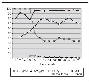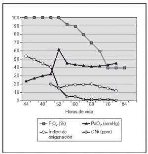 Recién nacida pretérmino de 26 + 6 semanas de edad gestacional y peso al nacimiento de 876 g (percentil 50). Nació por cesárea debido a oligoamnios y registro cardiotocográfico patológico. Bolsa rota 5 semanas con administración prenatal de antibióticos y corticoides. Intubación y administración de surfactante al nacimiento, con un test de Apgar de 5 y 7 al minuto y a los 5 min de vida. Se repitió la dosis de surfactante a las 6 h de vida por hipoxemia progresiva a pesar de la ventilación mecánica convencional (presión pico inspiratoria [PIP], 30; FiO2, 100 %) con mejoría transitoria. Se inició VAFO sin conseguir una mejoría de la oxigenación y desarrolló hipertensión pulmonar con gradiente de saturación pre-posductal de 80-68 %. En la ecocardiografía se comprobaron signos de hipertensión pulmonar sin cardiopatía estructural. En la radiografía de tórax se observó hipoplasia pulmonar. Se inició ONi a las 7 h de vida a 5 ppm con mejoría inmediata de la SaO2 (78 a 97 %) y de la PaO2 transcutánea (54 a 78 mmHg) como puede observarse en la figura 4. Se mantuvo el tratamiento con ONi durante 6 h permitiendo disminuir asistencia respiratoria y pasar a ventilación mecánica convencional (PIP, 20; FiO2, 40 %), posteriormente ONi a 1 ppm hasta su retirada transcurridas 20 h de tratamiento. Extubación programada a los 9 días de vida bien tolerada con CPAP nasal con FiO2 máxima de 30 %.