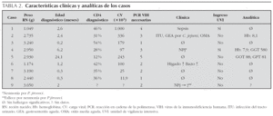 Cinco de los casos eran ya sintomáticos cuando se realizó el diagnóstico de infección VIH. Dos de ellos (casos 4 y 9), presentaron neumonía por Pneumocystis jiroveci. Uno presentó sepsis clínica, uno infecciones bacterianas de repetición y uno hepatoesplenomegalia. De ellos, 4 niños habían precisado ingreso hospitalario por causa infecciosa (síndromes febriles sin foco o infección respiratoria grave) antes del diagnóstico de infección por VIH. El caso 9, inicialmente asintomático, fue llevado a la urgencia hospitalaria con insuficiencia respiratoria grave y parada cardiorrespiratoria posterior, que no pudo revertirse, falleciendo instantes después, a la edad de 4 semanas. La necropsia identificaría neumonía por P. jiroveci. En la evolución posterior de los otros 8 niños, no ha habido ningún otro fallecimiento.