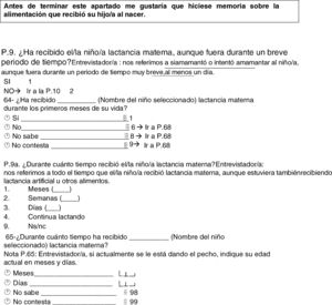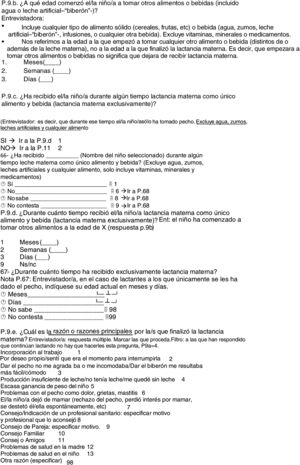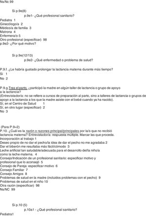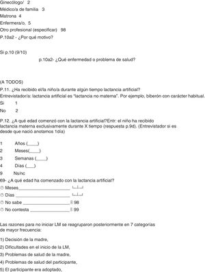 Recogida de datosTodos los datos utilizados en este estudio proceden de una parte del cuestionario epidemiológico del estudio ELOIN (anexo 1). En relación con la lactancia, este cuestionario incluye una adaptación de las preguntas 64-69 del Cuestionario de Menores de la Encuesta Nacional de Salud de España 2011-2012 (ENSE 2011/12)20 y unas preguntas de elaboración propia y respuesta múltiple sobre razones para no iniciar o para finalizar la LM que se diseñaron tras consultar a pediatras expertas en el tema.