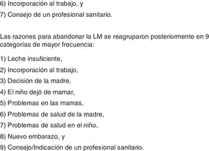 En la tabla 3 se describen las razones principales para finalizar la LM. Las dos razones más frecuentemente alegadas fueron la producción insuficiente de leche/no tenía leche/me quedé sin leche (32,3%) y la incorporación al trabajo (25,9%).