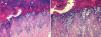 a) Hiperqueratosis compacta con cambios degenerativos vacuolares en segmentos superiores de epidermis (hematoxilina-eosina, ×100). b) Degeneración vacuolar de queratinocitos de estratos espinoso y granular, y presencia de múltiples gránulos citoplasmáticos eosinófilos (hematoxilina-eosina, ×200).