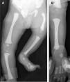 Figura 1. A) Fémur corto y curvado.B)Ausencia de peroné ipsolateral.