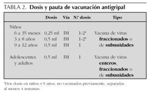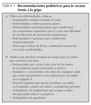 El CAV recomienda la vacunación antigripal anual, preferiblemente durante los meses de octubre y noviembre, de todos aquellos niños que pertenecen a categorías de riesgo de desarrollar complicaciones graves por la infección por el virus influenza o de cualquier sujeto que pueda actuar como vector de transmisión de la enfermedad a estos niños en grupos de riesgo (tabla 1), siguiendo la pauta especificada en la tabla 2, y considerando las contraindicaciones reseñadas en la tabla 3.