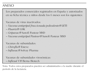 En la actualidad no se recomienda para la edad pediátrica la profilaxis o el tratamiento con amantadina o rimantadina 18,19. Los inhibidores de la neuraminidasa, zanamivir y oseltamivir, aunque en Estados Unidos son aplicables en la profilaxis de la gripe a partir de los 5 años y del año de edad, respectivamente 1, zanamivir no está aprobado en España para la profilaxis en niños menores de 12 años, oseltamivir sí está autorizado como profilaxis para niños a partir de los 12 meses.