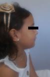 Proyección facial lateral. Fascies redondeada con mentón puntiagudo leve y retrognatia.
