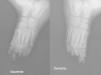 Radiografía simple oblicua de los pies izquierdo y derecho: ausencia de las falanges distales del 3.er y 4.° dedos del pie izquierdo, ausencia de las falanges distales del 3.er, 4.° y 5.° dedos del pie derecho, y reabsorción del extermo distal de la falange proximal del resto de los dedos de los pies en ambos pies.