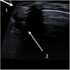 Ecografía pulmonar en el cuarto espacio intercostal de la línea media clavicular anterior. Visualizamos una imagen de desestructuración de la pleura (flecha1), con patrón de condensación (flecha2) y borde en sacabocados que ocupa un espacio intercostal con una profundidad de 1,2cm, compatible con neumonía incipiente.