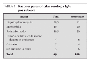 La edad promedio en que se solicitó la serología fue de 33 días (1-101), con una mediana de 25 días. Treinta de 49 niños con serología positiva (61 %) tenían menos de 30 días de edad cuando se realizó la prueba. Las razones por las que se solicitó la serología por rubéola se muestran en la tabla 1.