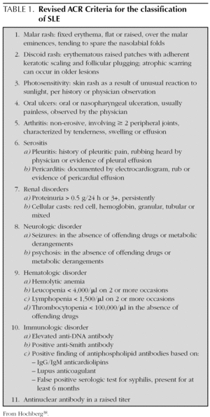 The heterogeneous nature of lupus can result in a diagnostic challenge for physicians. Since there is not a single symptom or finding that in itself is sufficient for making the diagnosis of SLE, the ACR has developed different criteria that can be useful as general clinical guidelines for the initial assessment of patients with suspected SLE. The guidelines, created in 1982 and updated in 1997 (table 1), combine 11 criteria (clinical and laboratory) and a diagnosis can be made when four or more of these criteria are present 38.