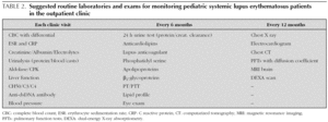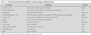 Treatment of SLE depends on the clinical manifestations and the presence/absence of major organ involvement (table 4). Corticosteroids are a major cause of morbidity and mortality in pSLE but they continue to be a mainstay of treatment due to their dramatic and rapid impact on lupus flares. Their effectiveness in treating SLE has been recognized since the 1950s. Intravenous (IV) pulse methylprednisolone (MEP) can be successfully used to treat major organ involvement and/or life-threatening manifestations of SLE. Antimalarials are effective for milder manifestations and improve bone-mineral density and dyslipoproteinemia 67. Cyclophosphamide (CYC) remains the first-line treatment for major organ involvement. It has been shown to reduce morbidity and improve mortality in lupus patients. Over 20 years ago a National Institute of Health (NIH) study 68 showed that monthly IV pulses of CYC were as effective, but less toxic, than daily oral CYC. Since then the gold standard immunosuppressive treatment of LN has been monthly IV pulse CYC for 6-7 months, in combination with high-dose glucocorticoids, followed by a 2-year maintenance phase (CYC for 2-3 months). All patients receiving CYC and high-dose glucocorticoids should also receive prophylaxis with low-dose trimethoprim-sulfametoxazole inorder to prevent the most common opportunistic infection, Pneumocystis jiroveci pneumonia.