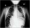 We report the case of a boy aged 3 years presenting with fever, breathing difficulty and abdominal pain of 3 days’ duration and chronic constipation. His general health was adequate, he had polypnoea (50 bpm), an oxygen saturation of 98% and crepitus in the right lung base. The abdomen was soft, depressible and painless on palpation.