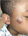 Paciente de 8 años que consultó por lesión en mejilla derecha de 4 meses de evolución, sin antecedente de picadura. Mantuvo seguimiento telefónico con su pediatra de atención primaria debido a las limitaciones de asistencia presencial por la pandemia de COVID-19. La sospecha diagnóstica inicial fue de foliculitis relacionada con el uso de mascarilla, cuyo neologismo es maskne.