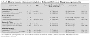 En la tabla 1 se presentan los resultados agrupados de los trabajos que comparan distintas pautas de tratamiento antibiótico oral en ITU de bajo riesgo, incluidos en el informe técnico de Downs16. Podemos observar como existe una tendencia a mayor eficacia en las pautas de mayor duración y en las que emplean cotrimoxazol con respecto a amoxicilina. No obstante, si observamos los años en los que se realizaron y los antibióticos que se emplearon (con altas resistencias en España de Escherichia coli), se entiende que la aplicabilidad de los resultados de estos estudios se vea muy comprometida.