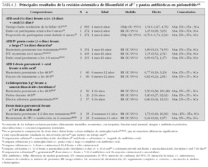En cuanto al tratamiento de las pielonefritis o ITU de alto riesgo, en la tabla 2 se presentan los principales resultados de la revisión de Bloomfield et al17. No se encontraron diferencias significativas entre las pautas comparadas, tanto para medidas de efecto inmediatas (es muy poco frecuente el fracaso clínico-bacteriológico con las pautas comparadas) como para las diferidas (el riesgo de daño renal crónico apenas varía con el tratamiento elegido). El tratamiento inicialmente oral no es menos eficaz que el intravenoso, mientras que las pautas intravenosas de corta duración parecen ser igual de seguras que las largas.