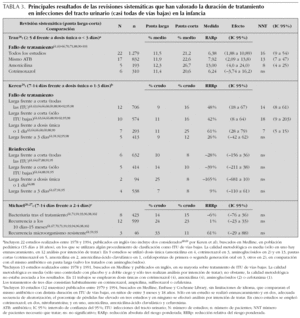 En la tabla 3 se presentan los principales resultados de tres revisiones sistemáticas que han analizado los estudios sobre duración del tratamiento en la edad pediátrica. Las principales diferencias existentes entre estas revisiones se deben a variaciones en los criterios de selección de estudios25-28, fundamentalmente la inclusión o no de trabajos con pautas de antibioterapia en dosis única. Las pautas largas son más eficaces que las cortas, si entre éstas se incluyen tratamientos con dosis única (diferencias absolutas entre el 5 y el 14 %; NNT entre el 7 y el 18). Sin embargo, cuando estas pautas se excluyen, comparando duraciones entre 3 y 4 días con otras más prolongadas, las diferencias desaparecen. Por otra parte, en la revisión de Tran et al28, que incluía tratamientos con dosis únicas, las diferencias entre pautas largas y cortas eran mayores con amoxicilina (diferencias estadísticamente significativas) que con cotrimoxazol.