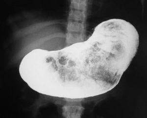 Figura 1. Tránsito esofagogástrico: cámara gástrica ocupada por una masa que dificulta su vaciado.