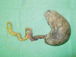 Figura 2. Extirpación completa del bezoar que ocupaba la totalidad del estómago y se extendía a duodeno y porciones distales de yeyuno.