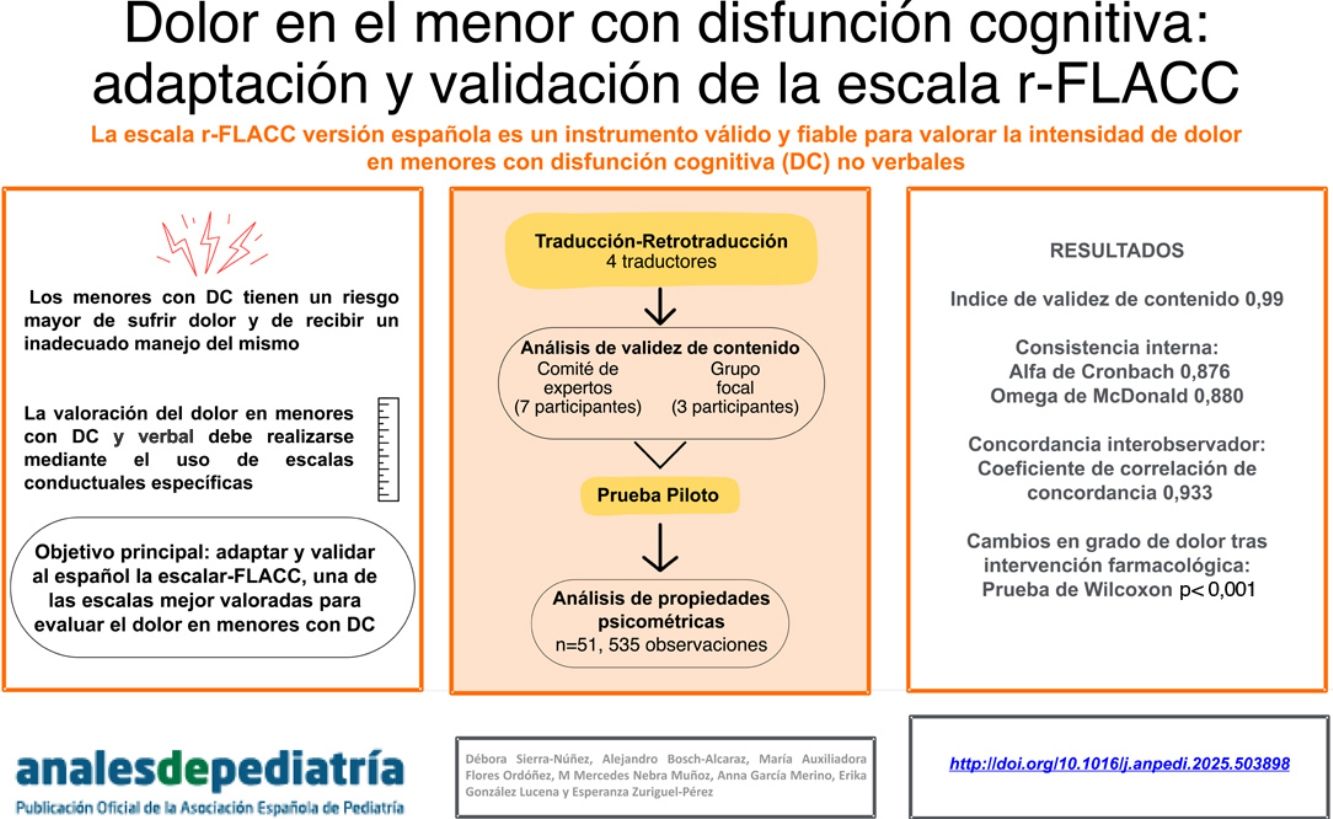 Los menores afectos de disfunción cognitiva presentan un riesgo mayor de sufrir dolor y de recibir un inadecuado manejo del mismo. La valoración del dolor en menores con disfunción cognitiva y verbal debe realizarse mediante el uso de escalas conductuales específicas. El objetivo principal de este estudio fue adaptar y validar al español la escala revisada Face, Legs, Activity, Cry and Consolability (r-FLACC), una de las escalas mejor valoradas para evaluar el dolor en menores con disfunción cognitiva.