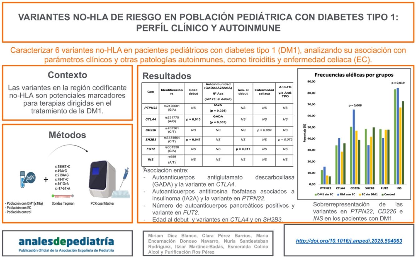 Con estos antecedentes, decidimos caracterizar cinco alelos de riesgo (rs2476601, rs231775, rs763361, rs3184504 y rs601338) localizados en regiones codificantes de los genes no-HLA PTPN22, CTLA4, CD226, SH2B3 y FUT2, y una variante intrónica en el gen de la insulina (INS), en una cohorte de pacientes pediátricos diagnosticados con DM1. Los objetivos de este estudio son estimar la prevalencia de las variantes genéticas analizadas en la población a estudio y compararla con una población control, así como analizar su posible asociación con parámetros clínicos (edad de debut, autoanticuerpos de DM1 al debut) y otras enfermedades autoinmunes (tiroiditis y EC). Esto permitirá evaluar la posible relación de estas variantes con la variabilidad clínica observada en estos pacientes, así como identificar potenciales marcadores para terapias dirigidas que puedan mejorar la calidad de vida de estos pacientes dentro de un enfoque de medicina personalizada.