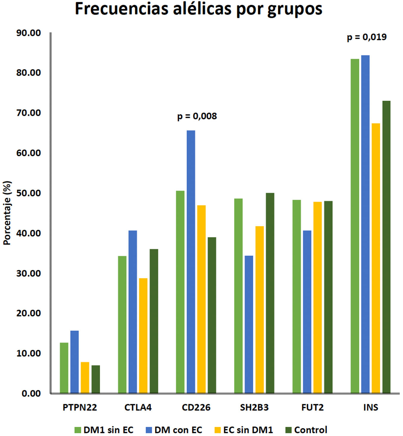 Las frecuencias alélicas, tanto en el grupo de pacientes con DM1 como en el grupo control, se muestran en la tabla 2. Se observó una sobrerrepresentación de las variantes en PTPN22, CD226 e INS en pacientes con DM1, objetivándose significación estadística en las variantes en CD226 (p=0,041) e INS (p=0,019).