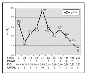 A su llegada a la UCIP, el paciente estaba taquipneico (80 resp./min), presentaba una disminución marcada de la ventilación bilateral con estertores crepitantes diseminados, espiración alargada, tiraje intercostal moderado y aleteo nasal, con un PCWDM de 7. La SaO2 era del 90 % con una FiO2 de 0,35 y en la gasometría capilar arterializada presentaba una presión parcial de dióxido de carbono (pCO2) de 52,9 mmHg, con un pH de 7,30. En la radiografía de tórax se observaban únicamente datos de hiperinsuflación y atrapamiento aéreo con discreto engrosamiento peribronquial. Se inició tratamiento con adrenalina nebulizada (3 mg de L-adrenalina al 1:1.000/dosis, cada hora, nebulizada con heliox a través de mascarilla con sistema en "Y" conectado a resevorio y nebulizador tipo "jet") y terapia continua con heliox (70 % helio/30 % oxígeno) adecuadamente calentado y humidificado a través de mascarilla con reservorio y válvulas unidireccionales, a un flujo de 12 l/min; la respuesta fue favorable, con mejoría clínica (PCWDM = 3) y gasométrica (pH 7,41; pCO2 de 44 mmHg) que se mantuvo durante 3 días. Pasado este tiempo, el paciente comenzó a deteriorarse de nuevo a pesar del tratamiento, presentando incremento en el grado de dificultad respiratoria (PCWDM = 8), hipoventilación generalizada muy marcada con estertores crepitantes diseminados, aumento de las necesidades basales de oxígeno (FiO2 de 0,45 para mantener SaO2 de 90 %) y episodios frecuentes de desaturación. Se realizó radiografía de tórax en la que se evidenciaba un patrón de infiltración alveolointersticial difuso bilateral, y en la gasometría arterial la pCO2 era de 68,5 mmHg con un pH de 7,30, por lo que se estableció el diagnóstico de SDRA.
